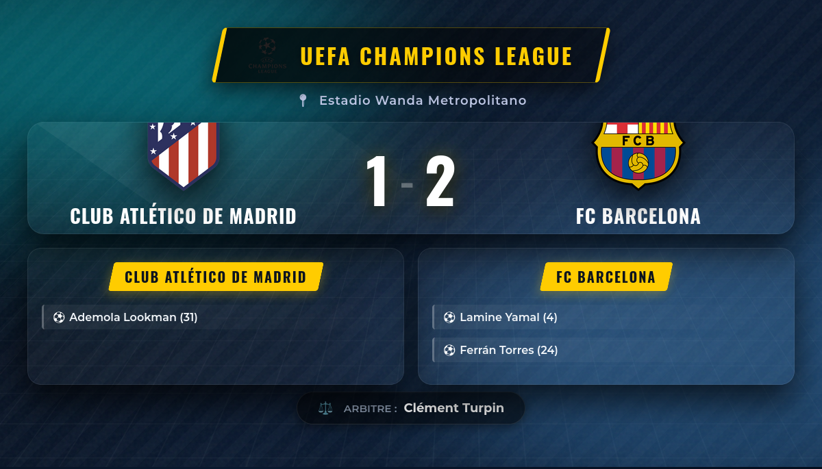 Au coup de sifflet final, le tableau d’affichage indique 1-2 en faveur du FC Barcelone. Si cette victoire à l’extérieur confirme la supériorité historique du Barça (9 victoires désormais en H2H), elle laisse un goût amer aux Catalans. En effet, malgré ce succès maîtrisé au Metropolitano, le score cumulé sur l’ensemble des deux matchs (3-2 pour l’Atlético) qualifie les hommes de Diego Simeone pour les demi-finales de la Ligue des Champions 🏆. Le Barça sort par la grande porte, ayant prouvé qu’il pouvait dominer tactiquement n’importe quelle équipe sur son terrain. Pour l’Atlético, cette défaite est un avertissement : la solidité défensive ne suffira pas toujours. Ils devront retrouver leur efficacité offensive pour espérer atteindre la finale. Pour Hansi Flick, c’est une fin de parcours cruelle mais riche en enseignements pour la saison prochaine, tandis que Simeone continue de prouver que son équipe est l’une des plus difficiles à éliminer en Europe 🟥.