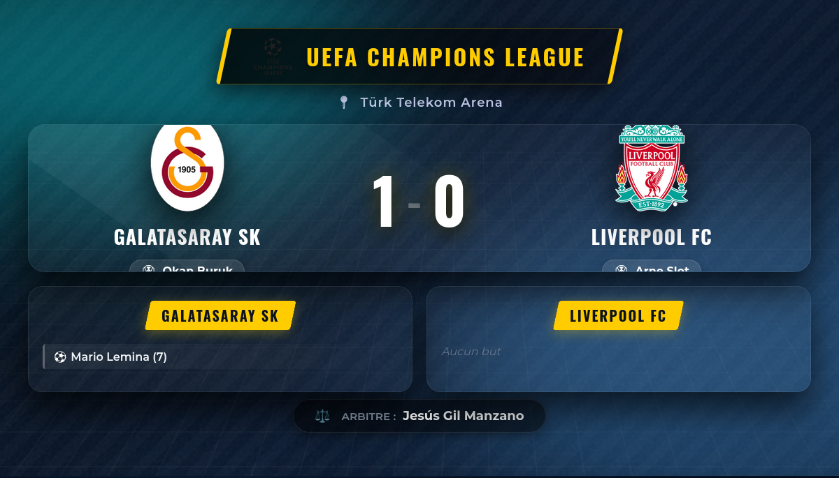 La Türk Telekom Arena a tremblé ce soir. Dans le cadre bouillant de l’UEFA Champions League, le Galatasaray SK d’Okan Buruk a accueilli un Liverpool FC en quête de certitudes sous la houlette d’Arne Slot. Ce match aller des huitièmes de finale portait en lui une tension palpable : l’histoire entre ces deux géants est riche, mais ce soir, seul le présent comptait. Avec une atmosphère électrique, les Lions ont su imposer leur loi dès les premières minutes, rappelant à l’Europe entière que leur antre reste une forteresse imprenable. 🏟️
