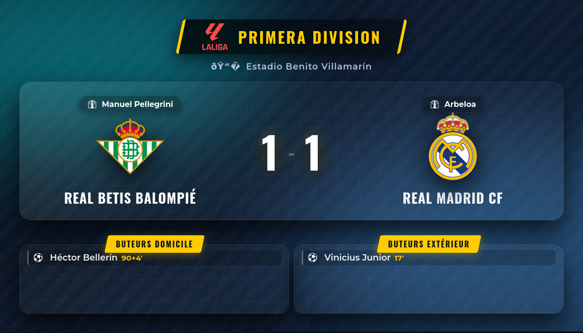 Le scénario semblait écrit pour une victoire madrilène après l’ouverture du score précoce de Vinicius Junior à la 17ème minute. Le Brésilien, par sa vitesse, a longtemps fait peser une menace constante sur la défense locale. Cependant, le football réserve toujours des surprises dans le money-time. Alors que le Real Madrid pensait tenir les trois points, Héctor Bellerín a surgi à la 90+4 minute pour arracher une égalisation héroïque. Ce but tardif a fait exploser le Benito Villamarín, transformant la frustration en une célébration collective intense. 🔥