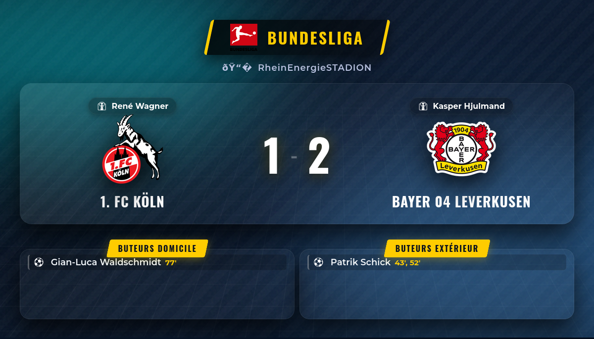 Au coup de sifflet final, le tableau d’affichage confirme la hiérarchie : 1-2. Pour le Bayer 04 Leverkusen, cette victoire est une opération comptable parfaite. Elle confirme leur domination historique sur Cologne et les propulse avec confiance vers la fin de saison. Kasper Hjulmand peut se satisfaire de la gestion de son effectif et de la forme étincelante de Schick. 🏟️