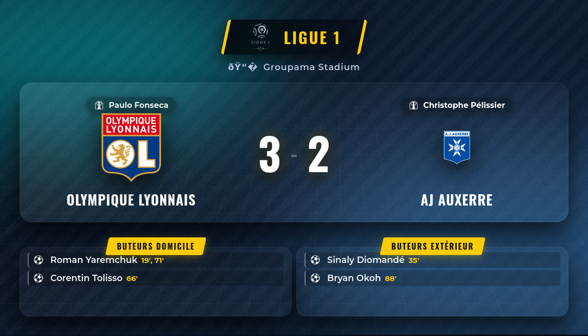 Le Groupama Stadium a vibré ce soir sous les projecteurs de la Ligue 1. Pour cette 31ème journée, l’Olympique Lyonnais, solidement ancré à la 3ème place, recevait une équipe de l’AJ Auxerre en quête désespérée de points pour sa survie. Sous la houlette de Paulo Fonseca, les Gones avaient pour mission de consolider leur position européenne, tandis que Christophe Pélissier espérait créer l’exploit. 🏟️