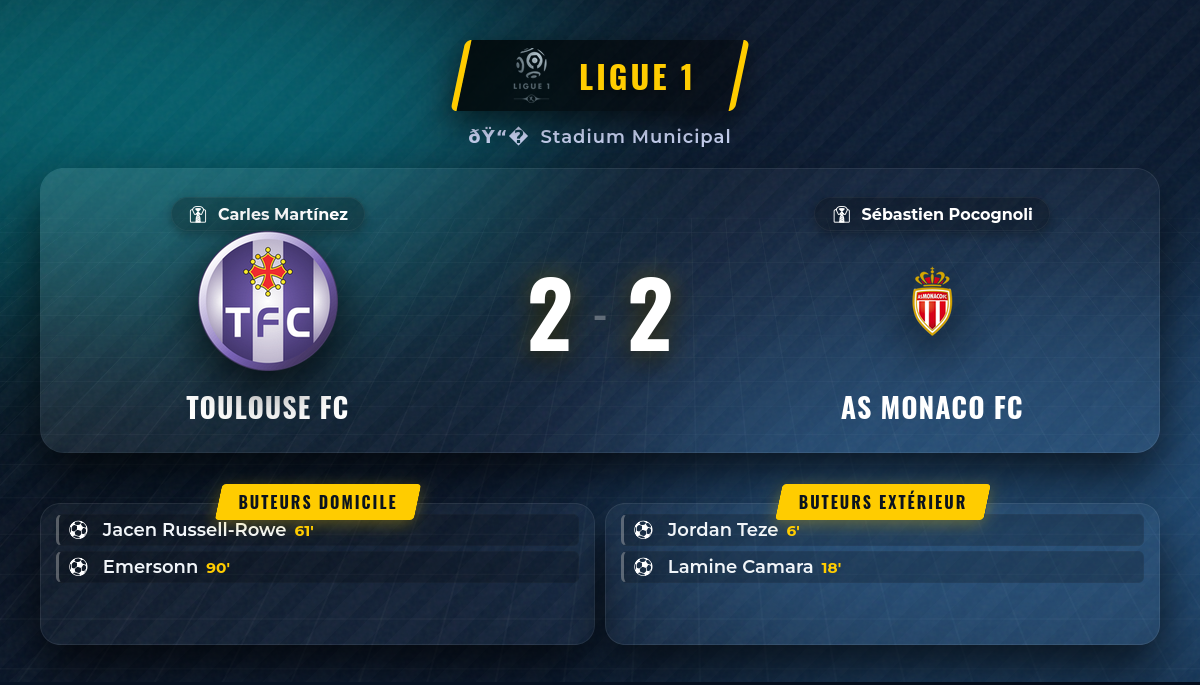 Ce match nul 2-2 reflète parfaitement la difficulté pour Monaco de tenir ses acquis face à une équipe toulousaine accrocheuse. Pour le TFC, ce point est une victoire morale qui confirme leur capacité à rivaliser avec les cadors. Monaco devra apprendre à verrouiller ses fins de match pour espérer grimper plus haut dans le classement de cette Ligue 1 passionnante.