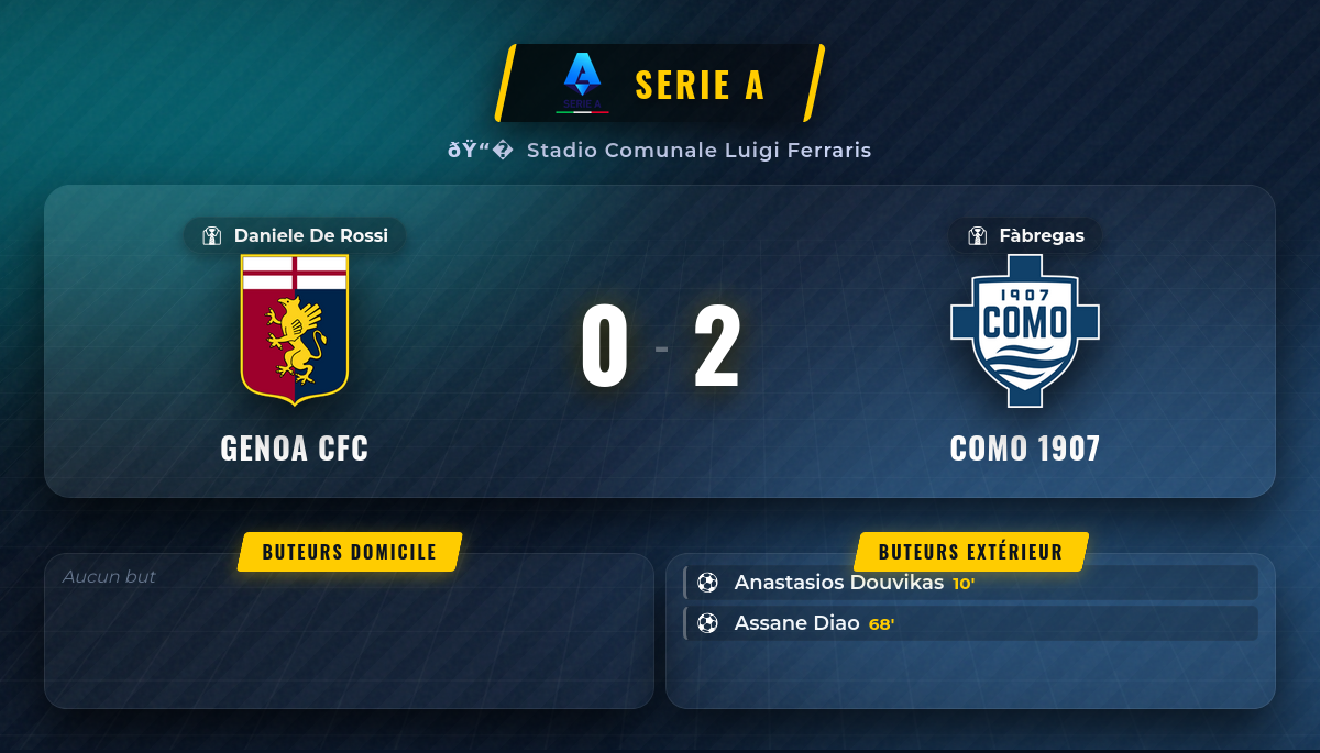 Le second acte, le coup de grâce, est arrivé à la 68ème minute. Alors que le Genoa tentait timidement de se projeter, une perte de balle fatale au milieu de terrain a profité à Assane Diao. L’attaquant de Como ne s’est pas fait prier pour doubler la mise d’une frappe chirurgicale. À 0-2, la messe était dite. Le Genoa n’a jamais semblé en mesure de renverser la vapeur, incapable de briser le verrou mis en place par Fàbregas. Le score final reflète parfaitement la physionomie d’une ‘victoire maîtrisée’ par l’équipe visiteuse, qui a su frapper aux moments opportuns. 🏟️