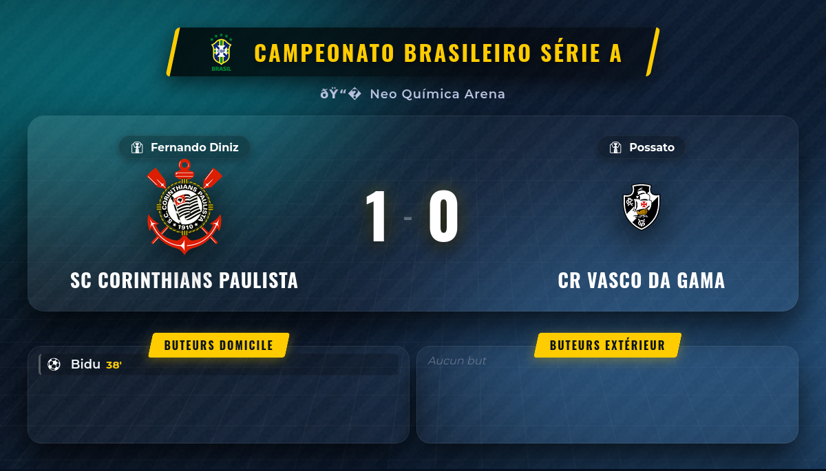 Le moment clé de cette rencontre est survenu à la 38ème minute. Alors que le match s’équilibrait, avec des tentatives de part et d’autre sans réelle concrétisation, le SC Corinthians a trouvé l’ouverture. Sur une action bien construite, c’est Bidu qui, d’une frappe précise, a fait exploser la Neo Química Arena. 🥅 Ce but, inscrit juste avant la mi-temps, a été un véritable coup de massue pour le CR Vasco da Gama et a complètement redéfini la physionomie de la partie. Le scénario de ‘victoire maîtrisée’ pour l’équipe à domicile a commencé à se dessiner à cet instant précis. Vasco, contraint de courir après le score, a dû modifier son approche, se montrant plus offensif mais aussi plus exposé. Malgré leurs efforts pour revenir, les visiteurs n’ont jamais réussi à percer le verrou corinthien. Il n’y a eu ni carton rouge, ni incident majeur pour entacher la rencontre, ce qui confirme l’analyse d’un match ‘plutôt calme / fair-play’. Le but de Bidu fut l’unique éclair dans une partie où la prudence tactique a souvent primé. Le coup de sifflet final de Davi de Oliveira Lacerda a scellé le sort du match : 1-0 pour le SC Corinthians Paulista. Une victoire nette, sans bavure, qui n’était pas une qualification pour un tour suivant, mais trois points précieux dans la longue et exigeante course du Campeonato Brasileiro Série A. 🔥