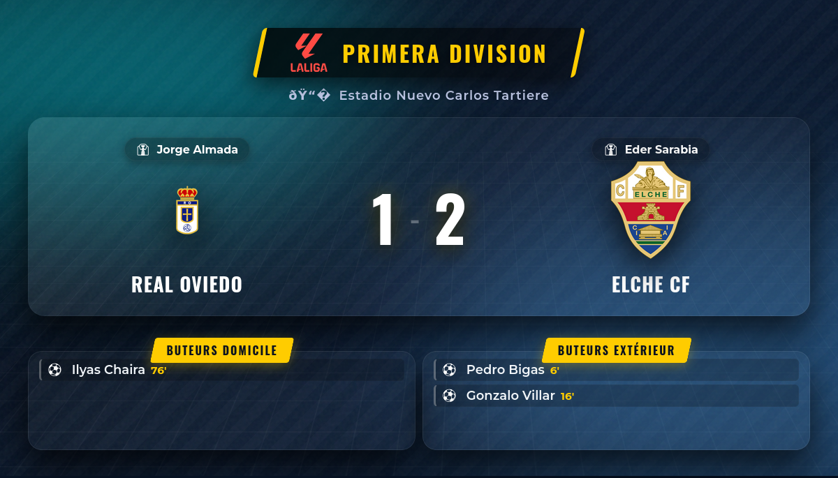 À 0-2 après un quart d’heure, le scénario de la ‘victoire maîtrisée’ pour l’équipe à l’extérieur était déjà écrit. Oviedo a bien tenté de réagir, notamment en seconde période. L’espoir est revenu à la 76ème minute grâce à une réalisation d’Ilyas Chaira, réduisant l’écart à 1-2. 🟨 Cependant, ce sursaut fut trop tardif. Malgré une poussée désordonnée dans les dernières minutes, Elche a tenu bon, faisant preuve d’une sérénité défensive exemplaire. Il n’y a pas eu de ‘money time’ héroïque, juste la froide réalité d’une équipe plus mature gérant son avantage jusqu’au coup de sifflet final.