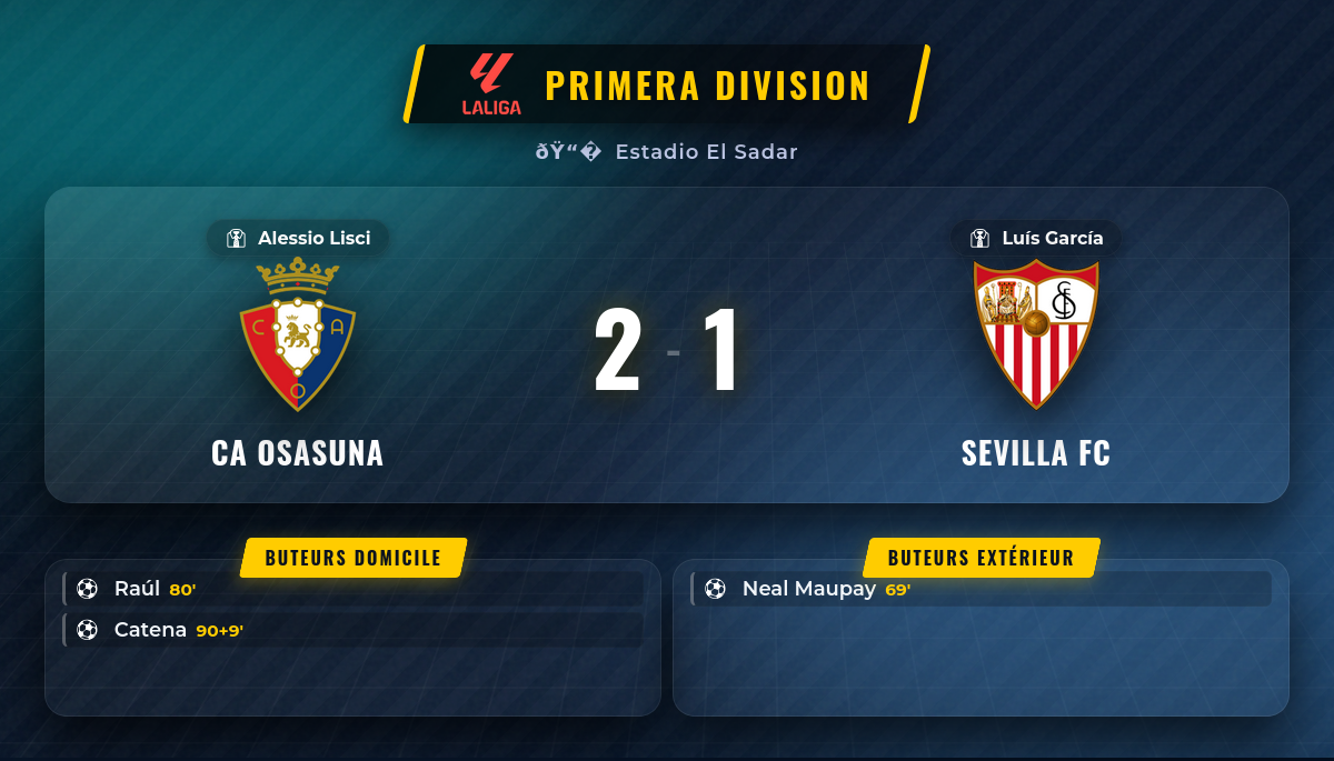 Le scénario de la rencontre a pris une tournure dramatique avec une véritable REMONTADA de la part de CA Osasuna. Alors que Sevilla FC avait ouvert le score à la 69ème minute grâce à Neal Maupay 🔥, les locaux n’ont rien lâché. La tension est montée d’un cran lorsque Raúl a égalisé à la 80ème minute, redonnant espoir à son public. Mais le coup de grâce est arrivé dans les ultimes secondes du temps additionnel. À la 90+9ème minute, Catena a inscrit le but de la victoire pour CA Osasuna, scellant un retournement de situation spectaculaire. ⚽ Ce scénario, où l’équipe à domicile a été menée avant de s’imposer, est le symbole de la résilience et de la combativité des Rojillos. Le score final de 2-1 en faveur d’Osasuna, malgré la défaite, ne scelle pas le destin de Séville dans cette compétition, le statut de qualification indiquant un match classique ou aller.