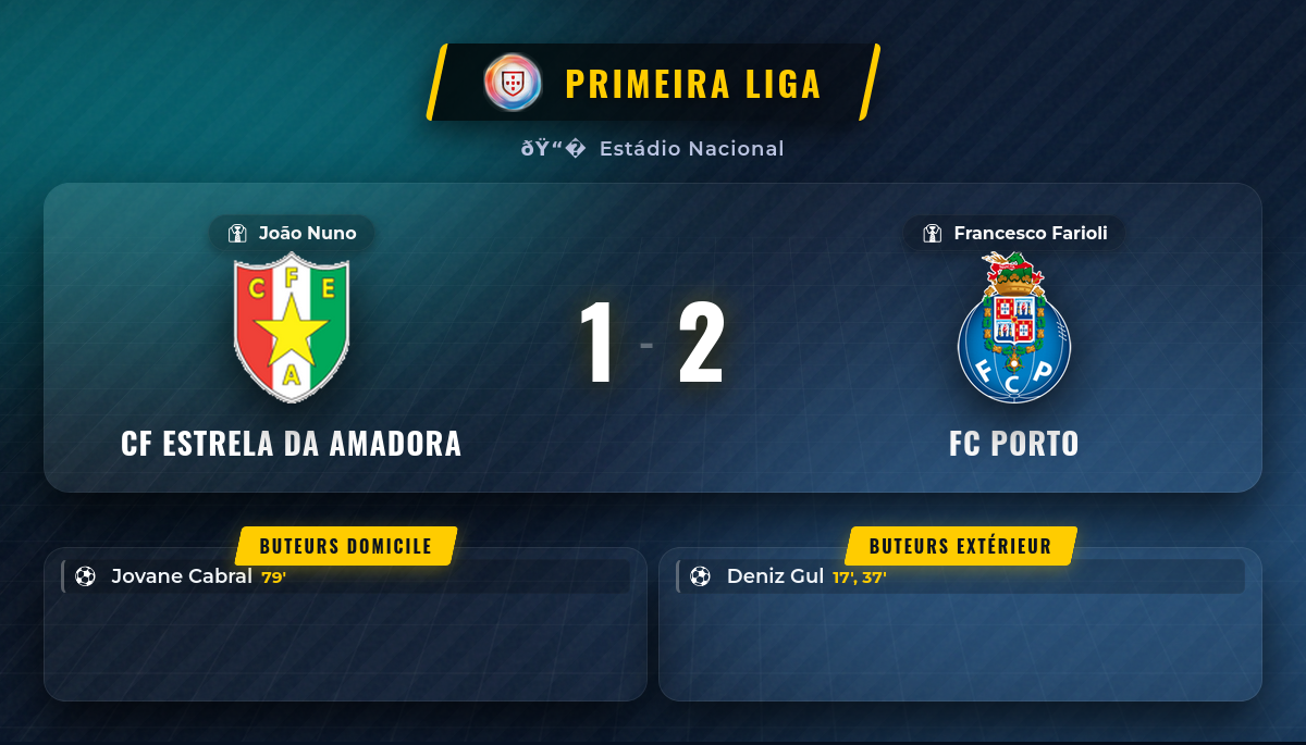 Cette victoire à l’extérieur du FC Porto, 2-1, confirme leur statut de leader et leur maîtrise dans cette Primeira Liga. Ils consolident leur première place au classement, envoyant un message fort à leurs concurrents. Pour le CF Estrela da Amadora, cette défaite est une déception, mais elle ne remet pas en cause leur parcours dans le tournoi, le match n’étant pas décisif pour une élimination directe. Cependant, elle souligne les difficultés à rivaliser avec les meilleures équipes du championnat. Les 28 points au compteur témoignent d’une saison en demi-teinte, et il faudra analyser cette rencontre pour corriger les erreurs. Le FC Porto, quant à lui, continue sa marche en avant, porté par la forme de ses joueurs comme Deniz Gul, auteur d’un doublé décisif. L’historique des confrontations reste largement à leur avantage, et cette victoire renforce leur confiance pour la suite de la saison. 🔥 Estrela da Amadora devra se remobiliser pour les prochaines journées, afin de sécuriser leur maintien et de montrer un autre visage face aux cadors.