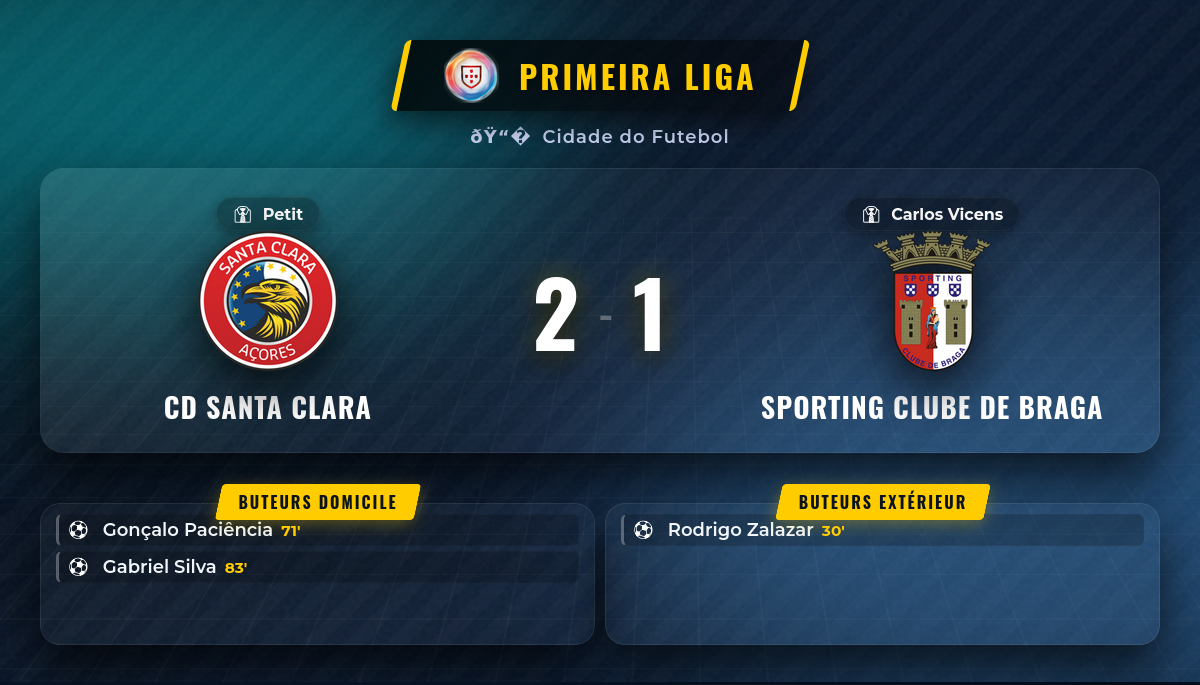 Chers passionnés de football, Sophie Wells vous salue depuis les tribunes virtuelles de match.electrotuto.com ! Ce soir, le Cidade do Futebol a été le théâtre d’une rencontre de la 31ème journée de la Primeira Liga qui, bien que n’étant pas un match à élimination directe, a offert un scénario digne des plus grands drames sportifs. Le CD Santa Clara, 13ème au classement avec 32 points, recevait le Sporting Clube de Braga, solide 4ème avec 56 points. L’enjeu était clair pour les locaux : prendre des points précieux pour s’éloigner de la zone de relégation. Pour Braga, il s’agissait de consolider sa position européenne et de ne pas laisser filer les équipes de tête. L’historique des confrontations directes penchait lourdement en faveur de Braga, avec 7 victoires contre seulement 3 pour Santa Clara sur 15 matchs. Une tendance que l’entraîneur de Santa Clara, Petit, cherchait désespérément à inverser face à Carlos Vicens, le tacticien de Braga. Le coup d’envoi a été donné sous l’œil vigilant de l’arbitre Luís Godinho, promettant une bataille tactique intense, même si la tension générale du match a été qualifiée de ‘plutôt calme / fair-play’. Mais ne vous y trompez pas, sous cette apparente sérénité, une véritable guerre des nerfs se préparait. 🏟️